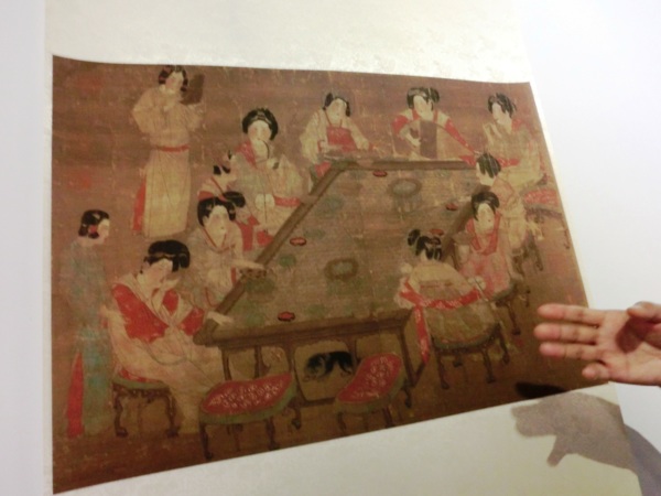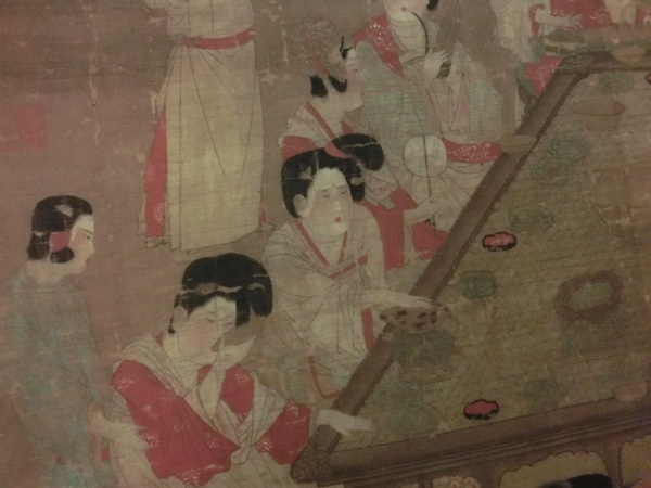 幅中畫後宮女眷十二人環案適坐,或品茗,或行酒令;中四人,並吹樂助興,所持用的樂器,自右而左,分別為篳篥、琶琶、古箏與笙。侍立的二人中,復有一女擊打拍板,以為節奏。從每個人臉上陶醉的表情來推想,席間的樂聲理應十分優美,因為連蜷臥在桌底下的小狗,都未被驚擾到。