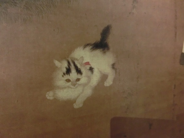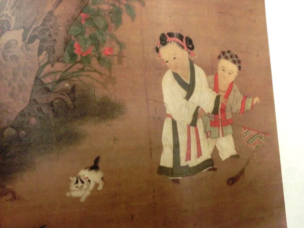 該圖畫姐弟兩人在庭院裡戲逗小花貓的情景。孩童衣著講究,髮式別致:女孩身穿右衽鑲邊素色長袍,腰系紅色綢帶,發盤雙髻,以紅白相間的髮帶裝飾,右手持方格錦旗,左手伸指。側身目不轉睛,眸子烏黑閃亮,透躍著天真無邪的童心;男孩在姐姐背後,髮式用紅繩系成多結形,身穿對襟紅邊素衣及白色長袂,左手持孔雀尾翎,亦睜大雙眼。兩孩雙目視線皆投入同一寵物——小花貓。極靈活的小花貓,紅白毛,黑色點綴首尾。院庭中褐色的假山,綠色的修竹,白色的臘梅,紅色的茶花,在一側爭芳鬥奇,各顯其本色。