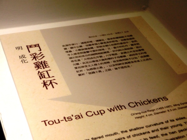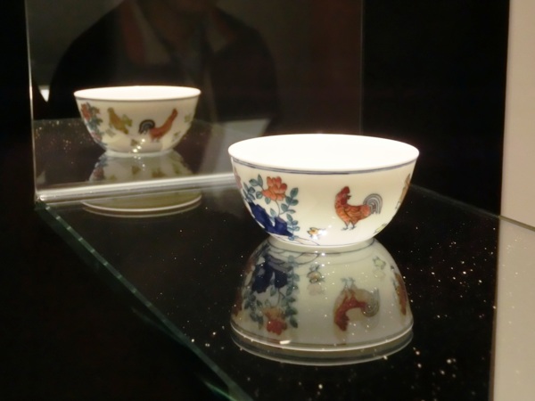 成化鬥彩雞缸杯是漢族傳統陶瓷中的藝術珍品,屬於明代成化皇帝的御用酒杯。是在直徑約八釐米的撇口臥足碗外壁上,先用青花細線淡描出紋飾的輪廓線後,上釉入窯經1300度左右的高溫燒成胎體,再用紅、綠、黃等色填滿預留的青花紋飾中二次入窯低溫焙燒。外壁以牡丹湖石和蘭草湖石將畫面分成兩組,一組繪雄雞昂首傲視,一雌雞與一小雞在啄食一蜈蚣,另有兩隻小雞玩逐。另一組繪一雄雞引頸啼鳴,一雌雞與三小雞啄食一蜈蚣,畫面形象生動,情趣盎然,後世多有仿製。