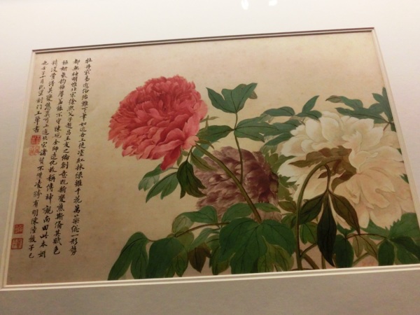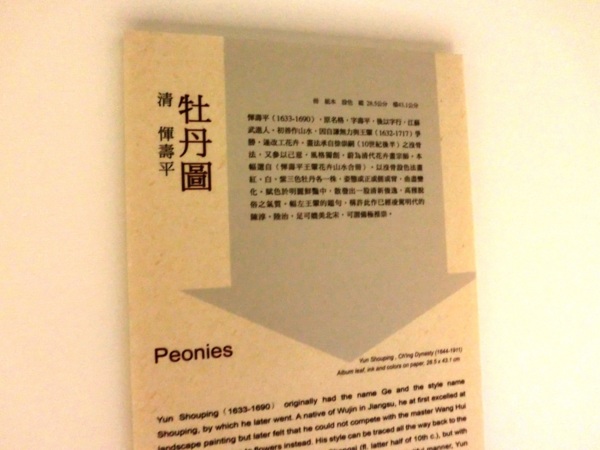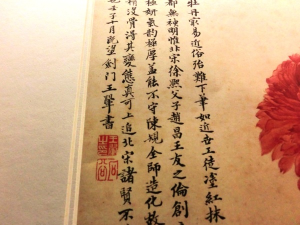 「牡丹最易近俗,殆難下筆,如近世工徒塗紅抹綠,雖千花萬蕊總一形勢,都無神明,惟北宋徐熙父子、趙昌、王友之倫創意既新,變態斯備,其賦色極姸,氣韻極厚,蓋能不守陳規,全造師化,故稱傳神,觀南田此本姸精沒骨,得其變態,眞可上追北宋諸賢,不僅淩跨有明陳(道複)陸(治)數子也。」由此題跋可知王翬對惲壽平的推崇備至。