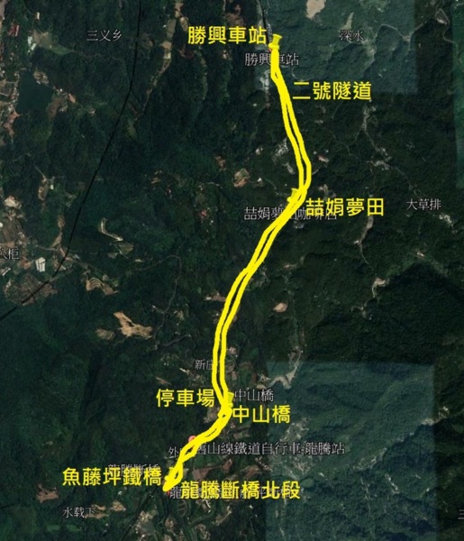 停車場往北→喆娟夢田咖啡→二號隧道→勝興車站(折返)→二號隧道→喆娟夢田咖啡→中山橋→龍騰斷橋北段→魚藤坪鐵橋→停車場
