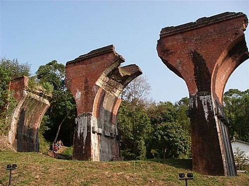 現今最能代表舊山線的地標~「龍騰斷橋」官方正式名稱為魚藤坪橋,兩代並存於魚藤坪溪谷上,第一代魚藤坪橋於明治39年(1906年)4月30日開工,翌年6月1日完工,由磚拱(北端4孔、南端2孔)、上承式鋼桁樑(中央跨溪部分)及鋼鈑樑組成,立於叢山萬仞中非常雄偉,再加上磚拱與鋼桁樑造型優美,在當時為台灣總督府相當重要的一項政績宣傳據點。