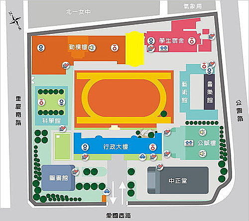 此外,文教機構則有國家圖書館、國家戲劇院、國家音樂廳、國立台灣博物館、國立歷史博物館、郵政博物館等;學校則有台大醫學院、東吳大學城區部和建國中學、北一女中兩所知名高中。鄰近的公園綠地則有二二八和平公園、中正紀念堂、臺北植物園等三大休閒去處;醫療設施則有臺大醫院、臺北市立和平醫院。『師生素質優良,文教資源豐富,交通方便,治安良好,校風純樸』為此校之重要特色。該校也是全臺唯一校本部在博愛特區內的大專院校。