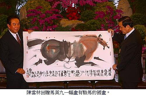 送給陳雲林一個象徵蘭嶼達悟族獨木舟的陶瓷花瓶,上頭還畫了代表台灣的蝴蝶蘭,馬總統強調希望兩岸未來互相承認,但前提也要中國肯答應吧?這時候,陳雲林回贈馬英九一幅中國知名畫家韓美林畫的駿馬圖,但送給「誰」?就是遲遲講不出來,而突如其來的這聲大聲的咳嗽,解救了陳雲林。