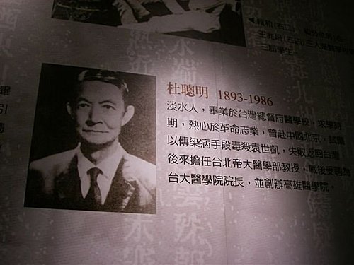 杜聰明,1893年誕生於淡水百六戛農家,9歲入書房啟蒙,11歲入滬尾公學校並寄宿在滬永吉街,17歲以第一名畢業。同年又以第一名考進當時的最高學府「台灣總督府醫學校」,他的成績一直保持第一,1914年以醫學校十三回第一名畢業。但是杜聰明先生並不是只會讀書的獨善其身者。他在醫學校求學時,熱心於革命志業,曾親赴中國北京,試圖謀刺梟雄袁世凱,為民除害。且自1921年任教台北醫專,一直堅守教育崗位,1937年任職台北帝大醫學部教授,戰後受聘為台大醫學院院長,又於1954年創辦高雄醫學院。一生作育英才、提攜後學,不遺餘力,貢獻於台灣之醫學教育,居功厥偉。並且積極從事鴉片、嗎啡、蛇毒等研究,發明減量弁毒療法及尿液檢查法,又自蛇毒中提煉鎮痛劑,自木瓜葉中製成赤痢病特效藥,不僅獲得極高的藥理學成就,而且濟世救人無數。