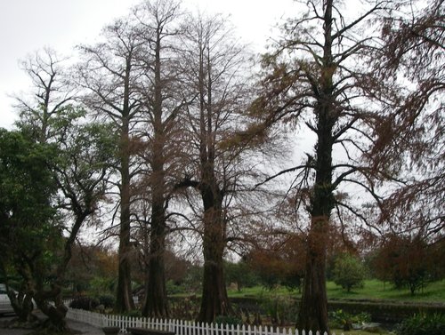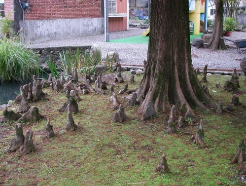落雨松原生美國密西西比河河口,又稱「美國水松」,是木本的溼地植物,為了適應沼澤環境,演化出呼吸根的形式,這也形成陳家松園的特殊景觀。落羽松容易被白蟻蛀蝕,宜蘭大學園藝系曾協助醫治樹木。