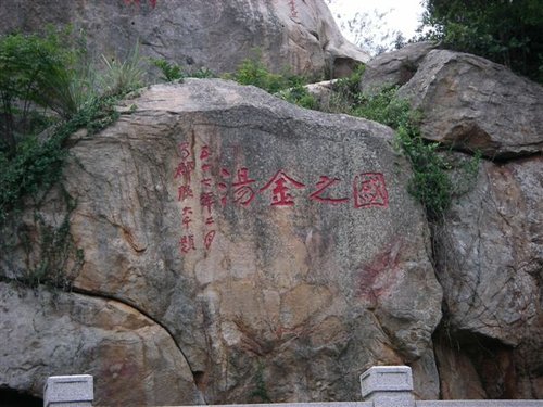 其上方的「大觀」則是燕山朱杰在康熙四十三年(1704年)所題。楊弘舉贊的另一側,為沒有署名與落款的「觀海」。由以上所題諸詞,大致可以猜想到眾人皆是有感於居高臨海景觀的雄偉,而道出心中的感受。 除了石碣之外,尚有明隆慶六年(1572年)丁一中(少鶴)所題的詩:「飛旆乘風信海潮;金門城外徙岧嶢。南溟地接三山近,北極天連萬里遙。逸客淹留塵跡偏、將軍嘯臥瘴煙消。蒼波漠漠情無限,欲附歸鴻向日飄。」另外,朱杰在題「大觀」的同時,也重鐫明嘉靖四十二年(1563年)楊弘舉所撰的〈虛江嘯臥亭碑記〉的全文。整體而言,虛江嘯臥碣群雖因石上苔蘚星布,班痕累累,但因該地地勢居高臨下,搭配上臨海遠眺的景觀,所以仍頗令人發思古之幽情。只是,近年來石碣的字跡塗著以紅漆,鮮明俗麗。加以後人所添置的石圓桌與石鼓凳,使得感受大異前人。
