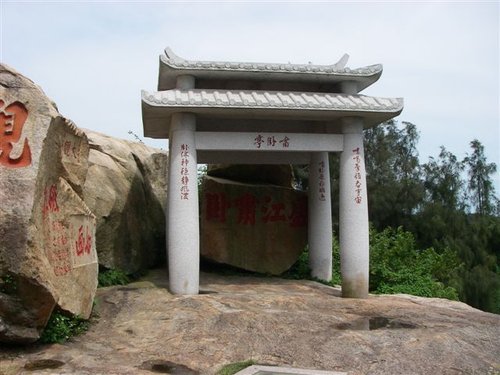 俞大猷,字志輔,號虛江,為明嘉靖年間的抗倭名將。他在戍守金門掃蕩倭寇時,曾登高遊於南磐山上。或許因在南磐山上臨海遠眺、滄海波濤,心中頓生萬丈雄心,他便在巨石上以自號題刻「虛江嘯臥」。據聞他當時原想在當地建亭,卻因調陞而只好作罷。 其後,俞氏的門人副千戶楊弘舉在戍守金門時,便在石碣前構築一亭,題額「後樂」以繼其志,並在石壁上勒石贊曰:「汪洋滄海、波浪怒來,我有片物,揮之使迴」。只可惜這座石亭於民國三十八年(1949年)前後,毀於砲火之中,於翌年整個拆除。楊弘舉題贊的左側,為清雍正六年(1728年),總兵呂瑞麟所題的「如畫」二字。