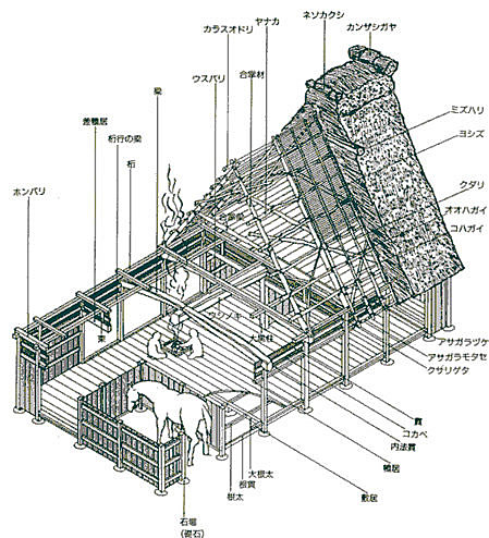 合掌屋神奇的地方就是合掌屋的全部建材都是採用當地出產的茅草和木材,整座屋子的結構和樑、柱以及桁、樑之間的承接,也都是以卡榫和結繩方式為之;還有屋頂,是先將野生茅草曬乾處理之後,最底層先編織成蓆子,覆蓋在以木條綁成格子狀的屋桁之間,然後再以茅草一層一層密實的覆蓋、綑紮而成,可耐風雨和積雪的重壓。所以合掌屋的落成完全是以人力而成。