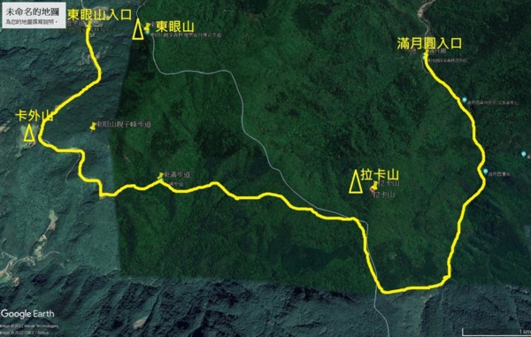 東滿步道是連結東眼山與滿月圓兩處國家森林遊樂區之間的健行路徑,自海拔870公尺的東眼山林道終點開始,越過北插天山與東眼山間海拔1130公尺的鞍部,再直下往海拔500公尺的滿月圓瀑布區;主要步道是利用昔日的台車道、木馬道,再與滿月圓往北插天山登山步道連接而成。是一條頗具挑戰性的健走路線,全程約為14公里左右。由"滿月圓國家森林遊樂區"出發,需走陡上600多公尺的上坡;若從東眼山出發,則為陡下。
