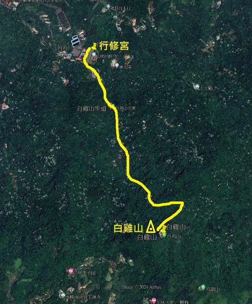 白雞山海拔740公尺,頂上有顆野牛基石,位於三峽插角溪的北邊,是一座大岩石山峰;山腰有座遠近馳名的「行修宮」,一般登白雞山都由此做為登山口;每逢假日山友、香客、遊人往來如織,而行修宮的後山公園,也是值的踏青休閒的好去處,當可不要錯過!"