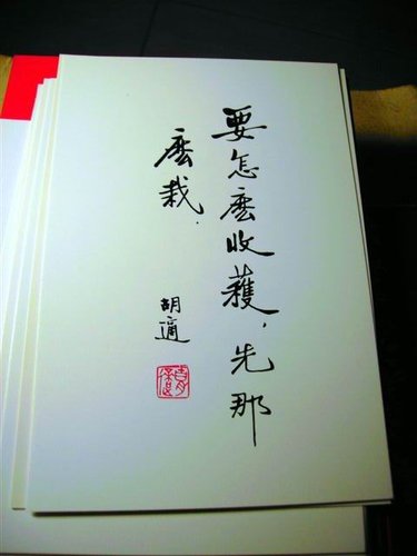 從相關著作了解平日行誼 四十五坪的陳列室中,栩栩如生的胡適半身塑像迎客,「要怎麼收穫,先那麼栽。」正是他最膾炙人口的親筆墨蹟,玻璃櫥櫃陳列胡適的中西文著作、手稿、信札、照片、印章及獲得榮譽博士時所穿的博士服等具有紀念意義物件,定期更換展品。