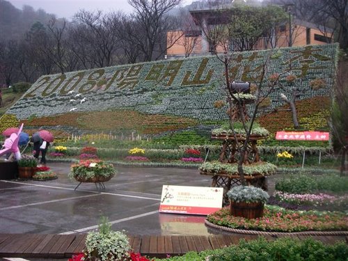 「陽明春曉」是今年陽明山花季的主題,在花鐘廣場前的花牆壁畫,用魯冰花、情人菊、非洲鳳仙、銀葉菊、聖誕紅、四季海棠等各式花卉,共1萬5千盆的各式花卉組合而成。