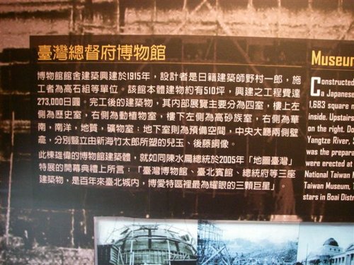 展場依據博物館發展之歷程劃分三個階段、四大展室,第一室主題展示臺灣博物館前身-以清代臺北城內天后宮為展示主軸;第二室主題展示臺灣博物館在日據時期之興築歷程;第三室主題為兒玉、後藤銅像陳列室;第四室主題為展望未來。 這次展覽除將展出兒玉源太郎與後藤新平銅像等多項罕見且頗具意義的史料之外,李乾朗教授並親自調繪與提供天后宮全景復原考證圖首次展出,平面圖包括前殿、正殿與左右護室形成兩殿四合院之格局。另外一件珍貴展品為日據時期臺灣博物館在興建時,舉行「上棟式」(相當於臺灣傳統的上樑禮)所留下的棟札,其一面寫有5位日本神衹之名,分別為天之御中主神、手置帆負神、彥狹知神、屋船久久能知神、屋船豐受姬神。而棟札的另一面則記錄當時參與建造工程之人士姓名與其職稱。