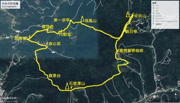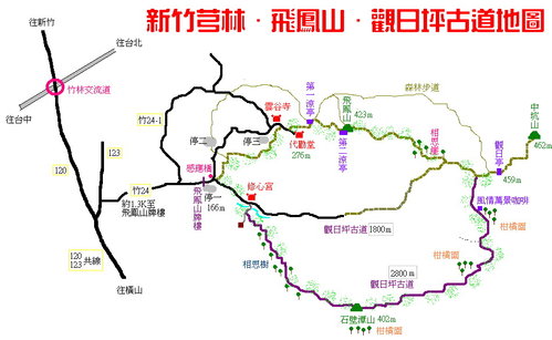 →飛鳳山→相思崖→觀日亭→中坑山→石壁潭山→修心宮→感應橋