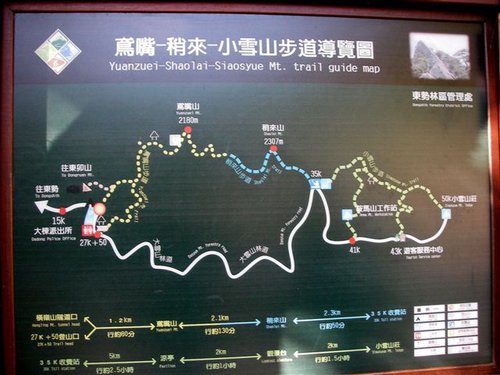 鳶嘴山是東勢地區的地標,遠在豐原、石岡即可看到,由於山尖如鳶鳥之嘴而得名。遊客登臨山頂,視野極佳,可以遠眺東勢、石岡、豐原、大甲、清水等平原,天氣晴朗時更可遠望台灣海峽船隻往來,可說是東勢地區最熱門的登山路線。走完兩條登山步道全程約需四、五個小時,如單登鳶嘴山 約需三小時、稍來山約需二小時,可隨個人體力加以選擇。