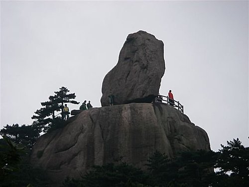 導遊說到飛來石上去摸摸那天外來的巧石,運氣財氣福氣隨你來。巨石聳立在岩石平台上,高12米、長7.5米、寬2.5米;其下的岩石平台長12至15米,寬8至10米。兩大岩石之間的接觸面很小,上一石似從天外飛來,故名“飛來石”。