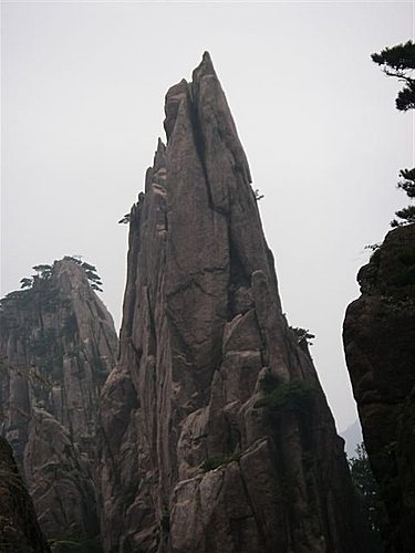 第二次岩體:粗粒、中粗粒似斑狀結構,岩性堅硬,塊狀構造,不易風化。岩石中,以斜節理為主,也兼有直立的和水準的節理,構成了雄險壯觀的奇峰異谷;在黃山的七十二座名峰中,就有三十七座山峰是由主體期侵入的粗粒似斑狀花崗岩組成,尤其以蓮花、天都、雲門、雲際等名峰為代表的雄渾大峰,盡顯黃山峰體之奇偉。