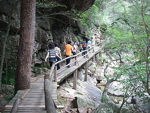 峽谷溪流一路輕歌曼舞,為牯牛湖注入活力。溯湖而上,有兩條秀色逼人的峽谷,一為大演坑,長五公里;一為小演坑,長四公里。大演坑開闊清幽,蜿蜒而上,仿佛走進黃山情人谷 。其間移步換形,一步一景,古樹華蓋,巨石如屋。鳥鳴聲、松濤聲、流水聲,此起彼伏。大峽谷又像翡翠項鍊,串起黃龍潭、潛龍谷、仙人聚會等景點。