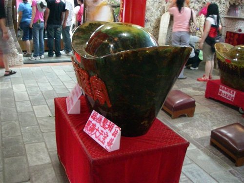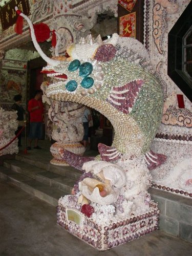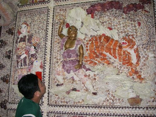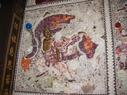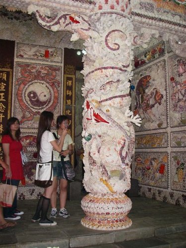 貝殼廟內有一條十八羅漢洞,據說入洞即有避災除難的效果,洞內也是珊瑚與貝殼的世界, 供奉著十八羅漢,而出入口放置著一對大酒壺,稱之〝聞酒壺〞,可供遊客聞聞看;入口聞酒壺寫道:『鴻圖大展有前途』,而出口聞酒壺寫道:『頭腦清醒不糊塗』,頗耐人尋味。