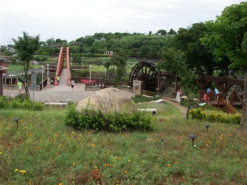 福德水車生態園區位於三芝名人館旁,甫於95年12月20日完工。是利用三芝鄉大屯山純淨豐沛的水源,打造成以水車為主題的休閒公園。主要設施為大型木造水車、生態沉砂池、景觀橋、木棧休憩平台、環園步道及各式植物。紅色景觀橋長42公尺,橫跨八連溪兩岸,成為溪上的特殊景觀。