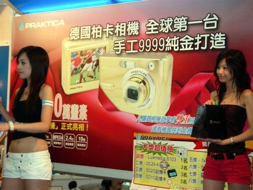 德國柏卡黃金相機,外在以9999純手工3盎司純金打造,並採用SHARP千萬畫素CCD感光元件、2.4吋液晶螢幕,3倍光學變焦等,定價99,900元。