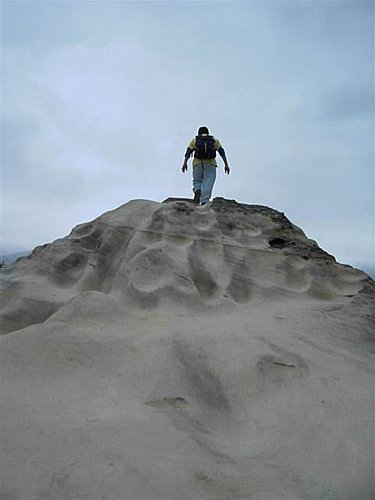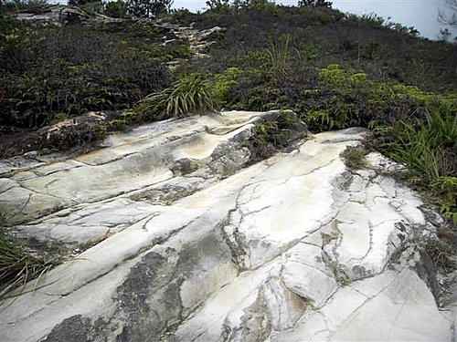 雪白的砂岩是濱海的證據:海濱或河口的淤沙經過海水的淘洗,沈積成雪白的砂粒,再經久遠歲月的膠結作用,成為厚層堅硬的砂岩。