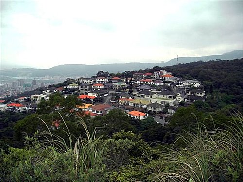 駐足於此,對照山腳下擁擠的北投市容,左前方沿山坡而建的威靈頓山莊顯得特別清幽,白牆紅瓦在山色襯映之下更是醒目。