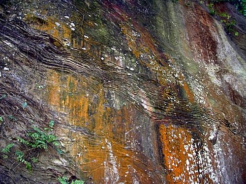 有時海流較強把泥沙掏洗得又潔白又乾淨,也造就了現在的「砂岩」,在堆積的過程中,有一些鐵質沉澱在上面,使得砂岩上有一層層的「紅色紋理」。