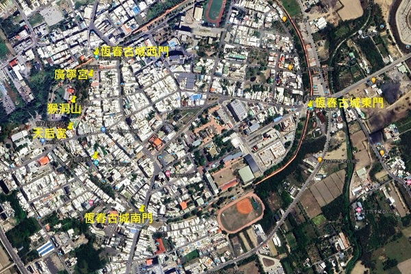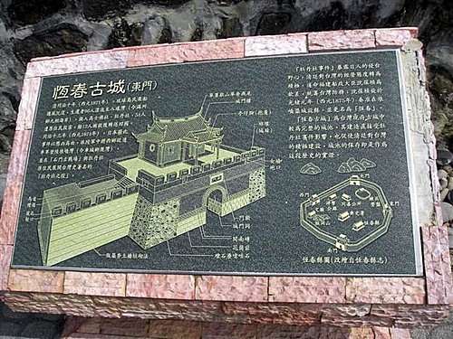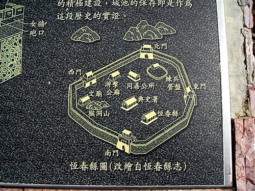 今天台灣唯一保留四個城門和部份城牆的恆春縣城,起建於清光緒1年(1875),至1879年落成。它有東南西北4門,周長880丈;1988年測量顯示,共長2,550公尺。