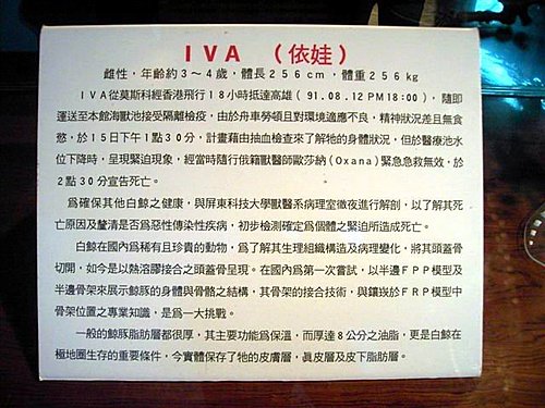 2002年海生館由俄羅斯引進6頭小白鯨,其中依娃和露比不耐遠程運輸而死亡,館方研究人員除進行解剖了解病因,內部臟器也已分送大學及研究單位提供學術研究,同時委請專家製作成標本,計畫以教育展示的方式,發揮博物館的教育功能,也是國內首度公開展示白鯨標本及模型。