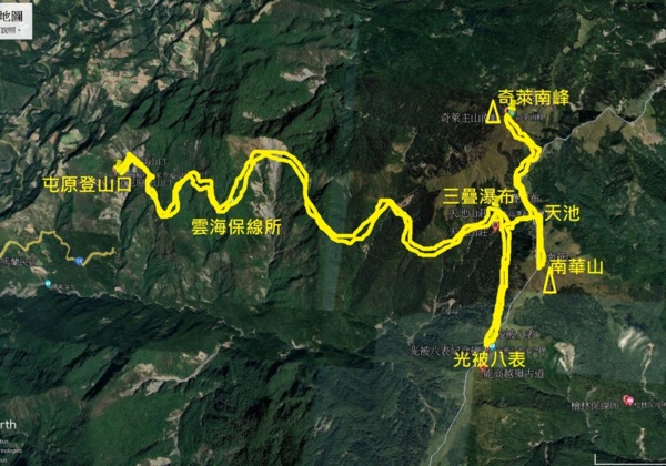 屯原登山口→雲海保線所→三疊瀑布→天池山莊→光被八表碑(南投、花蓮界碑)→天池山莊→南華山(能高山北峰)→奇萊南峰→天池山莊→三疊瀑布→雲海保線所→屯原登山口