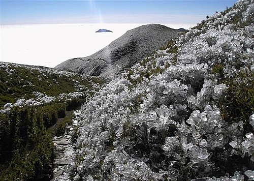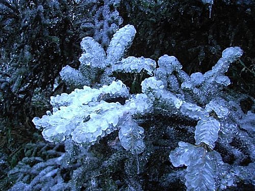 凍雨是如何形成的呢?凍雨多在強冷空氣或寒潮到達時,由於冷暖空氣交鋒而產生。當有冷鋒入侵時,使鋒面下的氣溫和地面溫度都降至0℃以下,而鋒面上方的氣溫卻在0℃以上且較潮濕,在鋒面上方的雲層內形成的雨滴落入溫度低於0℃的氣層時,就能變成過冷雨滴。這種過冷雨滴一旦降到溫度低於0℃的地面或地物上,立即凍結成冰,形成一層密實光滑的、有時是透明的玻璃狀冰殼。凍雨落在表面溫度低於冰點的樹、電線上後,馬上在它們週邊結成晶瑩透明的冰層,這時雨滴繼續落在結了冰的物體表面上慢慢下垂,於是結成了一條條冰柱,有的地方稱它為“冰掛”。冰掛千姿百態,耀眼奪目。廬山、黃山等名山,在冬季常被凍雨打扮得分外妖嬈。