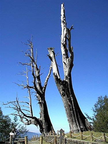 位於台廿一線新中橫公路一百四十七公里 旁,標高二千六百公尺的二株紅檜巨木,早在民國五十二年塔塔加地區發生森林大火時被焚燬,但枯木仍相依而立,十四年前新中橫公路開通後成了著名的景點,並成為情侶及夫妻遊客眼中,見證愛情的「夫妻樹 」。
