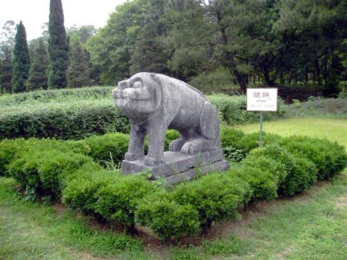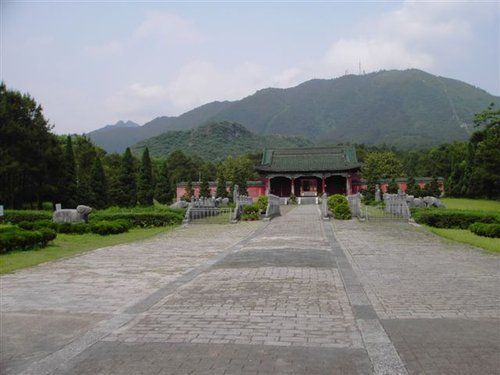 朱佐敬是靖江悼僖王朱贊儀庶長子,永樂九年(1411)承襲王位,成化五年( 1469)逝世,在位58年。謚號莊簡。陵建於永樂年間,背靠堯山大頭嶺,依山勢向西偏南約40度,正前方有一天然陵口,一望無際,左右則群峰林立,形似拱衛。陵園占地528oo多平方米,呈長方形,兩道圍墻。中軸線上有陵門、玉帶橋、中門、享殿和地宮。神道兩旁有11對石像生,依次為守陵獅、華表、狻猊、獬豸、狴犴、麒麟、武士控馬、大象、秉笏文臣、男侍者、女侍者,造型凝重、古樸。陵門外左右首還建有廂房。經過幾百年的風雨侵蝕,陵園原已頹敗,荊棘叢生。1984年起按舊制復建了陵門、中門、玉帶橋、享殿和左右廂房。