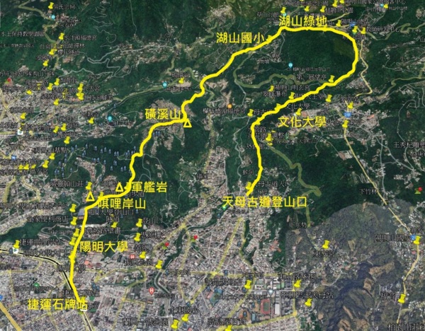 國立陽明大學→唭哩岸山→軍艦岩→磺溪山→硫磺谷→湖山國小→天母古道