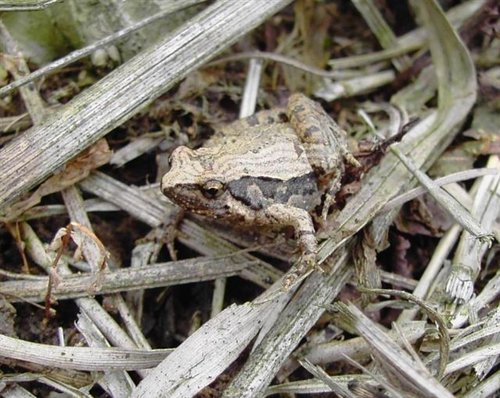 <辨認特徵> 小型蛙類,體背為土黃色至深褐色,背部有左右對稱的流水紋,體側各有一條黑帶,腹面為淡灰色至淡黃色,雄蛙喉部至頷下為黑色。出現於草地及森林底層,台灣低海拔山區至平地廣泛分佈。