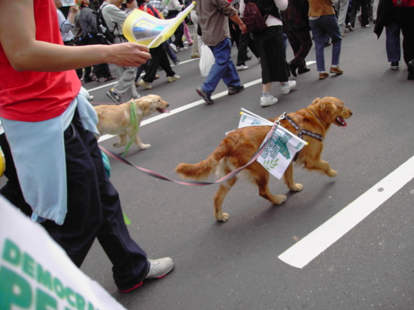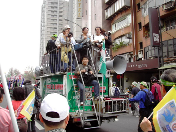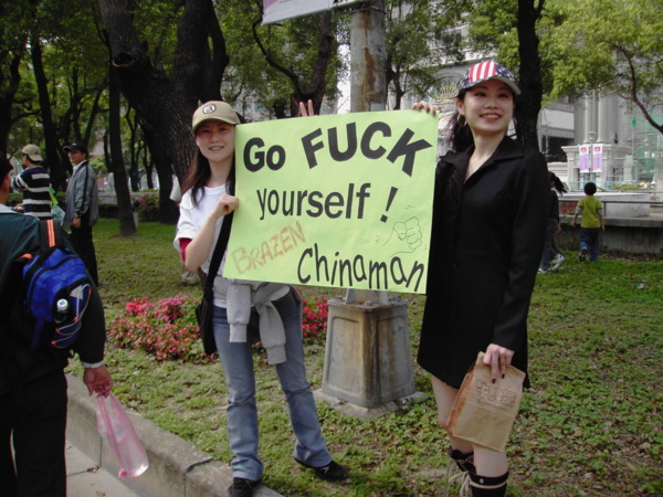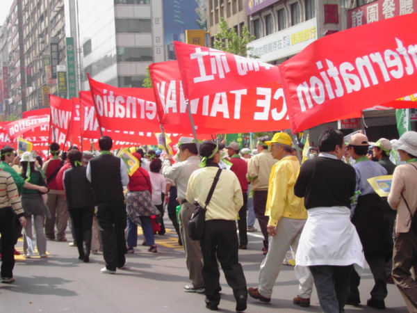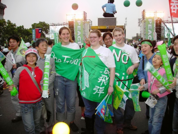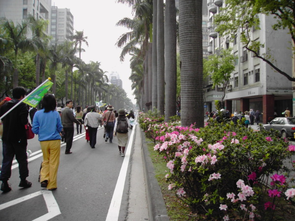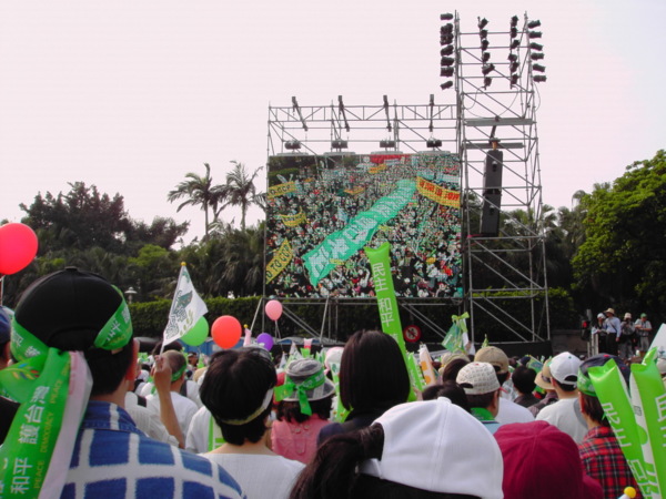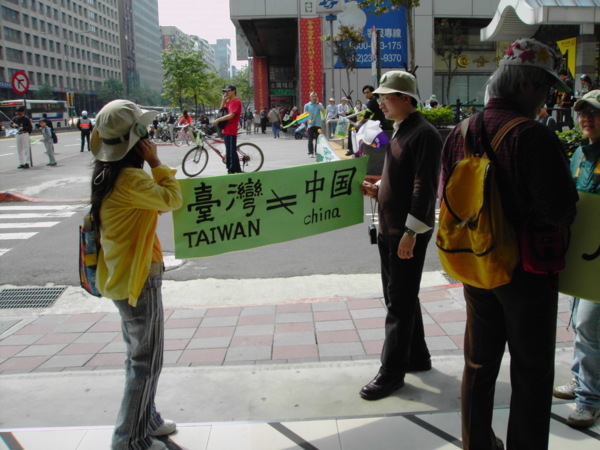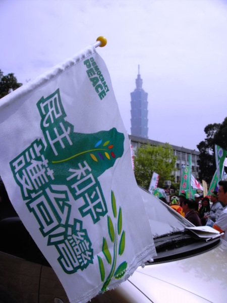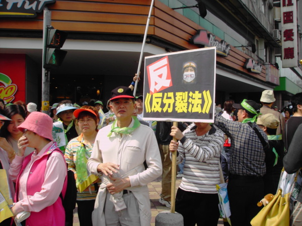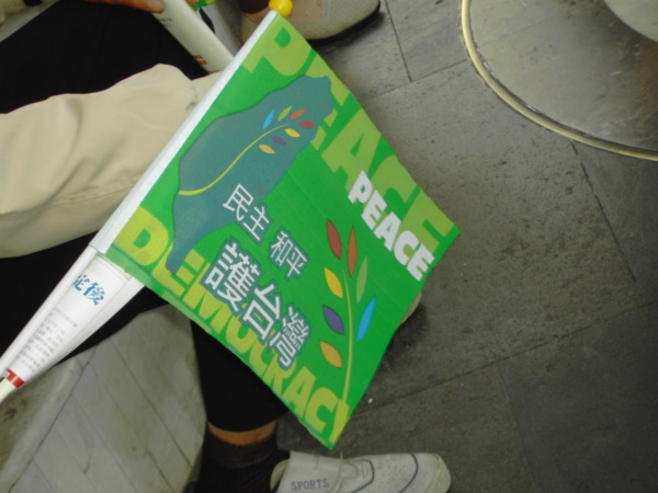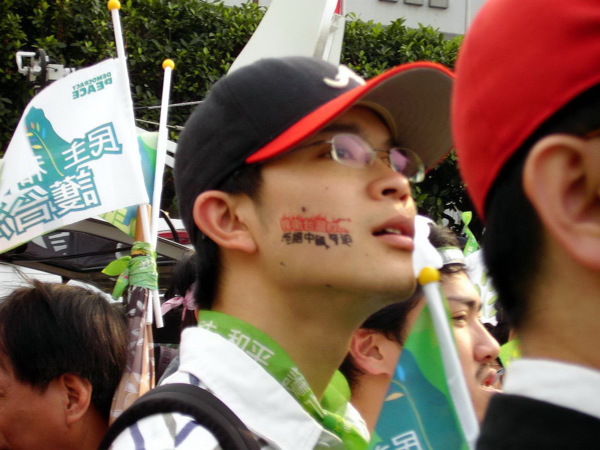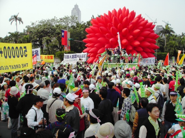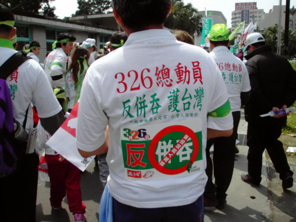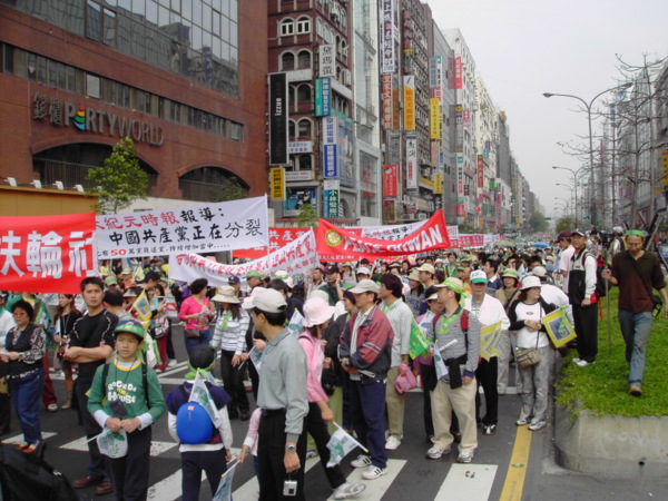 今天,一百萬人站出來遊行,因為:我們珍惜民主,反對中國干涉台灣內政的「不民主」心態!我們愛好和平,反對中國武力威脅台灣的「非和平」手段!