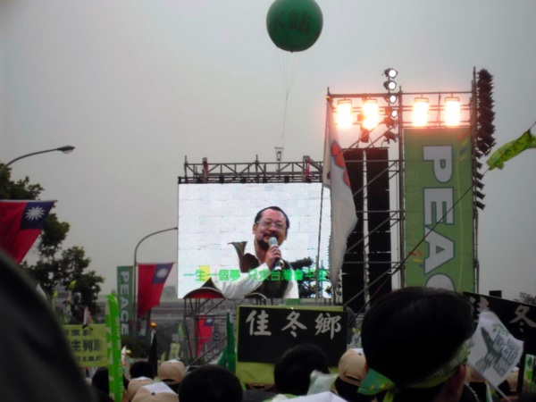 今天,一百萬人站在這裡,要捍衛的不是個人的利益,不是任何黨派的利益,也不只是一個世代的利益,我們要捍衛的是,數百年來,台灣不同族群的祖先,渡過黑水溝,追求自由的心願,以及幾十年來,走過白色恐怖,以血淚換來的民主成就!我們的心情激動,意志堅決,站在這裡的一百萬人,代表著兩千三百萬人的心聲。兩千三百萬人心中,只有一個聲音,那就是:保民主、愛和平、護台灣!我們手牽手、心連心,團結在我們家園的土地上。