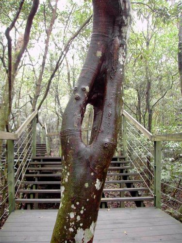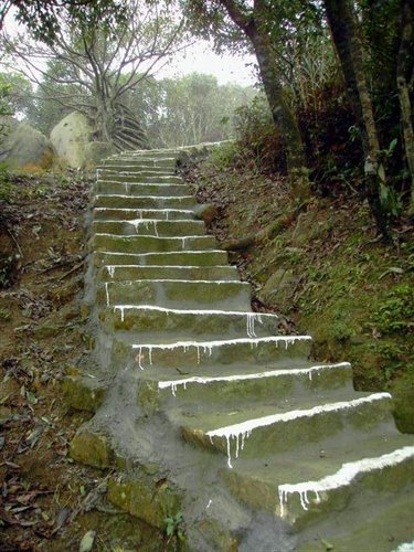 人是此地入侵者,樹才是原住民,所以當路與樹衝突時,則保留樹而形成有樹在步道中的景象。