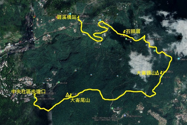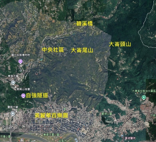 捷運圓山站搭213公車-大崙尾山登山口站-中社步道-大崙尾山步道-大崙尾山-大崙頭山步道-大崙頭山-大崙頭山森林步道-石頭厝-碧溪橋站搭小18公車-走路過自強隧道-美麗華百樂園