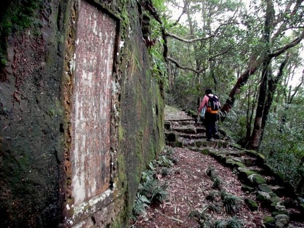 淡蘭古道,據載最初係平埔族人因狩獵而踏出之山徑,後因墾民東移拓荒而漸成道路,路線前後凡三變。清嘉慶十五年(1810)後,淡蘭古道遂成為入蘭之「官道」與「正道」,為台北與宜蘭之間,商旅及食貨往返必經之孔道。同治六年(1867)冬,台灣鎮兵劉明燈,率兵北巡,由淡入蘭,有感於先民開疆拓土之艱辛,與山道雄偉磅礡之風景,乃題下「金字碑」、「虎字碑」、「雄鎮蠻煙碑」供人瞻瞻仰。