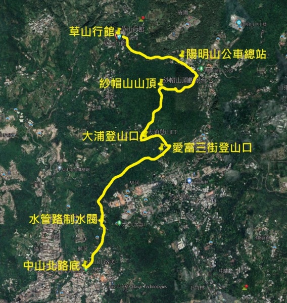 中山北路底天母古道登山口 - 天母古道 - 紗帽山大浦登山口 - 紗帽山山頂 - 陽明山公車總站 - 草山行館