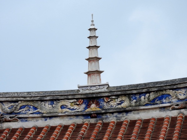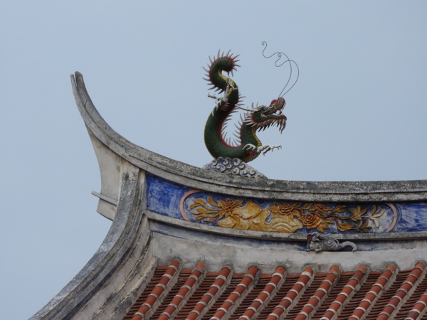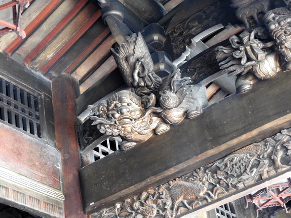 正殿屋頂的垂脊下方有四個人物造型,分別為文聖張亞子、武聖關公、巧聖魯班、樂聖師曠,這四位聖賢裝飾在正殿的屋頂,稱為「四聖朝天」。正脊上方裝飾有「雙龍護塔」的剪黏,為民國七十五年重修時的作品。重修前此塔為七層佛塔,修護後將其恢復成早年五層的塔身,即我們現在所看到的造型。