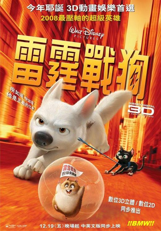 迪士尼第四部3D動畫,請到飾演孟漢娜走紅的麥莉(Miley Cyrus)與約翰屈伏塔配音,講述一隻自認為擁有超能力的明星小狗波特的冒險故事。《雷霆戰狗》由迪士尼出品,與《瓦力》等共14部電影入選第81屆奧斯卡最佳動畫片候選名單,除了傳統2D數位版本外,迪士尼將會同步推出3D立體版本,讓觀眾可以帶上3D眼鏡,與波特一起體驗身歷其境的聲光效果。