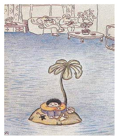 作者高段的地方是在它把一個很常見、很普通的場景(一個人因船難流落海中孤島的畫面;試著用手把圖面的上面三分之一遮起來,這幅畫根本就不起眼)借用過來,表達了孩子的孤寂與無助。如果再用點想像力,孩子可能已經呼救過多少次,直至聲嘶力竭,最後放棄了。因為父母聽不見,雖然離他不遠,卻是遙如天邊。