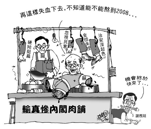 蘇貞昌快變輸真慘了,蘇院長的真正生路是揭竿起義,公開奉勸阿扁自動下臺.如果阿扁一怒之下換閣揆,蘇貞昌就會凝聚淺綠,淺藍與中間選民的人氣為2008鋪路,在堅持政務官道德形象上大大加分;如果沒有被阿扁撤換,更可以放心大膽推動順天應人的政策.