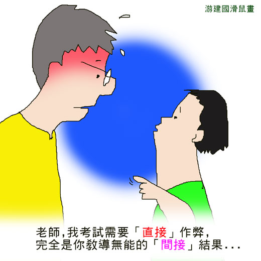 現在的小學生都說他們"直接"犯錯,是老師"間接"教導的錯誤了,阿扁,這都是你"直接"錯誤的示範造成的結果,如今還要"間接"要求什麼退場條件嗎?