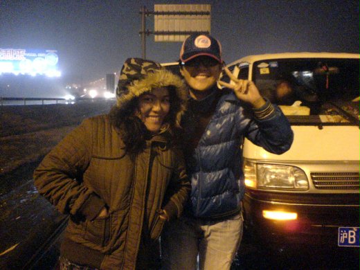 車子在高速公路的路肩停了下來,我和我妹不知在興奮啥!修車,幫不上忙!聯絡,沒有認識的,那,拍照留念--在氣溫6度的上海高速公路上拋錨!〈待續〉
