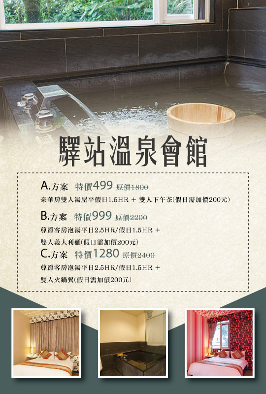只要499元起,即可享有【烏來-驛站溫泉會館】烏來森林雙人幸福泡湯趣~〈含A.豪華房雙人湯屋平假日1.5HR + 雙人下午茶(假日需加價200元) / B.尊爵客房泡湯平日2.5HR/假日1.5HR + 雙人義大利麵(假日需加價200元) / C.尊爵客房泡湯平日2.5HR/假日1.5HR + 雙人火鍋餐(假日需加價200元)〉